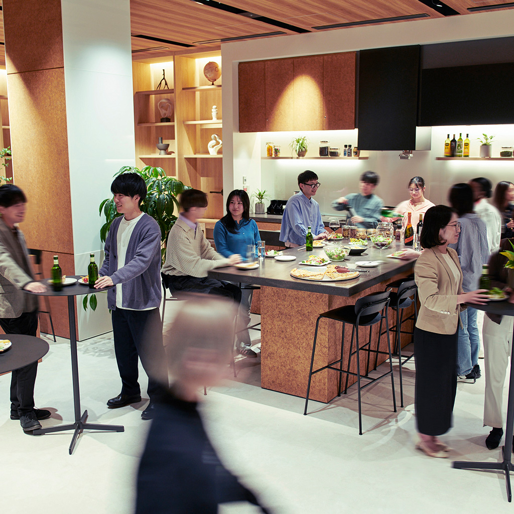 キッチンカウンターを中心にしたこのエリアは、イベントやセミナーの後のネットワーキングやランチミーティングにも最適。カジュアルな雰囲気の中で、自然と会話が生まれ、共創の機会が広がる空間です。