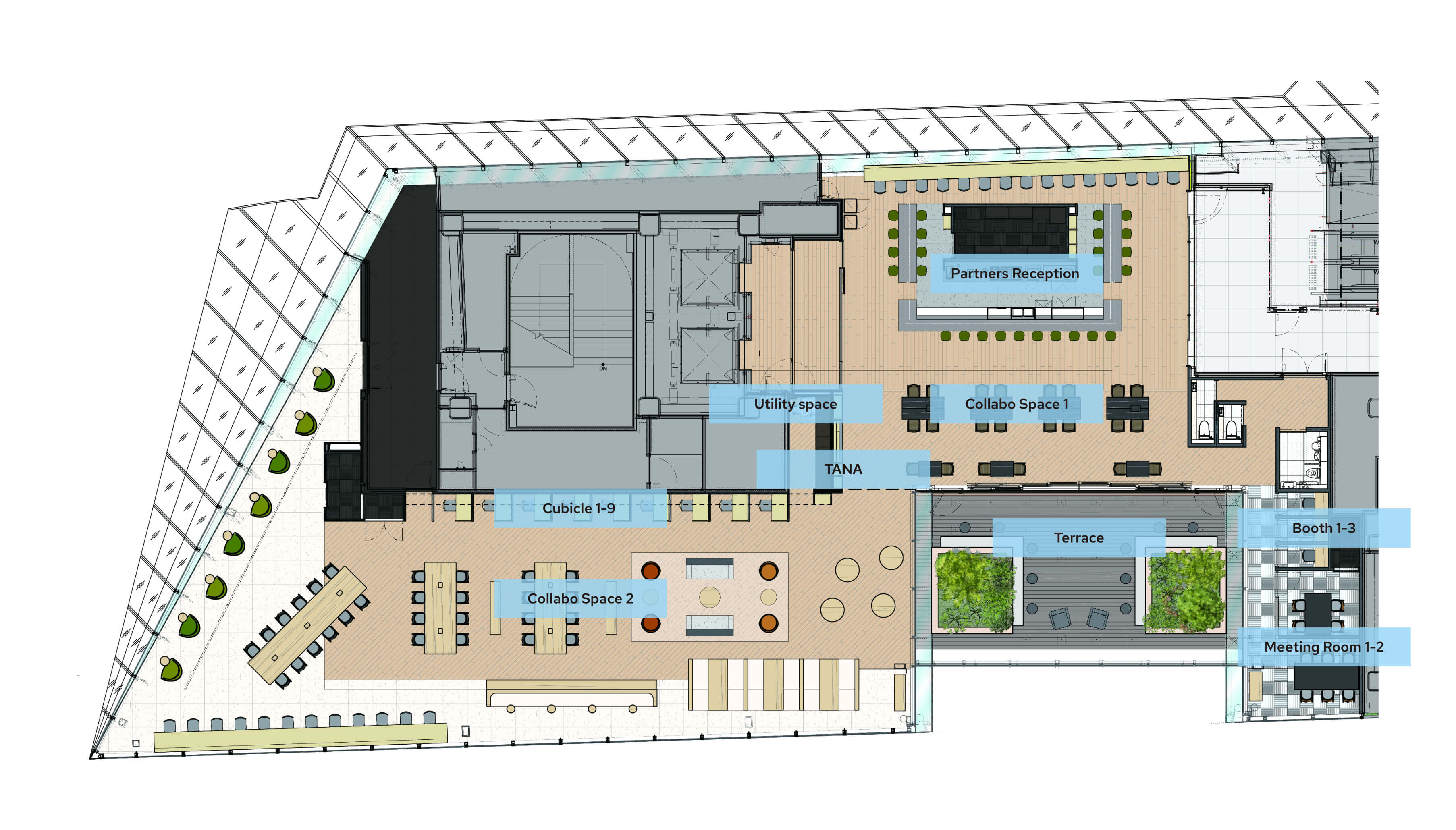 Collabo Spaceはその名のとおり、会員同士、会員と外部の方がCOLLABO(共創)をするための空間です。テラスに面したオープンスペースは開放的な空間でイベントやセミナー後の気軽な交流やランチミーティング等、リラックスしながら新たなアイデアやコラボレーションが生まれる活気あるスペースが、その奥には落ち着いたラウンジやブースも備えます。ワークスタイルに合わせてゆったりと仕事をすることができ、ここで生まれたアイディアをビジネスやプロジェクトに落とし込み、推進するのに最適の空間です。