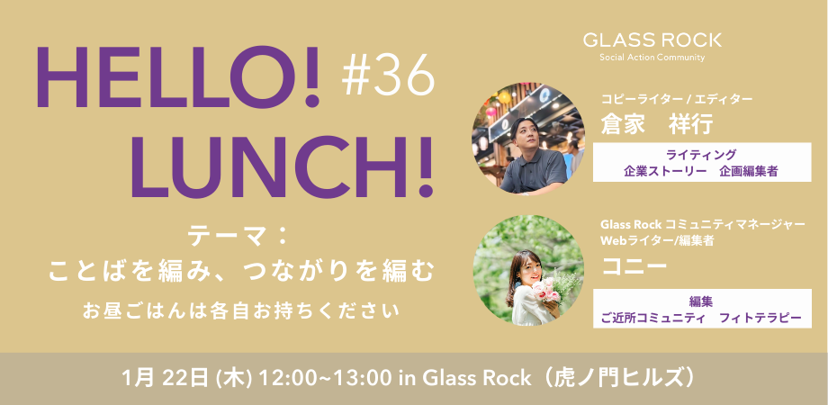 Glass Rock 〜 Social Action Community 〜は企業・行政機関・NPO・市民等が領域を超えて社会課題解決を目指す共創コミュニティです。💫「施設でのアクションのきっかけがほしい」という声に応え、領域を超えた人々が「気軽に」交流できるカジュアルなランチ会を定期的に開催しています。