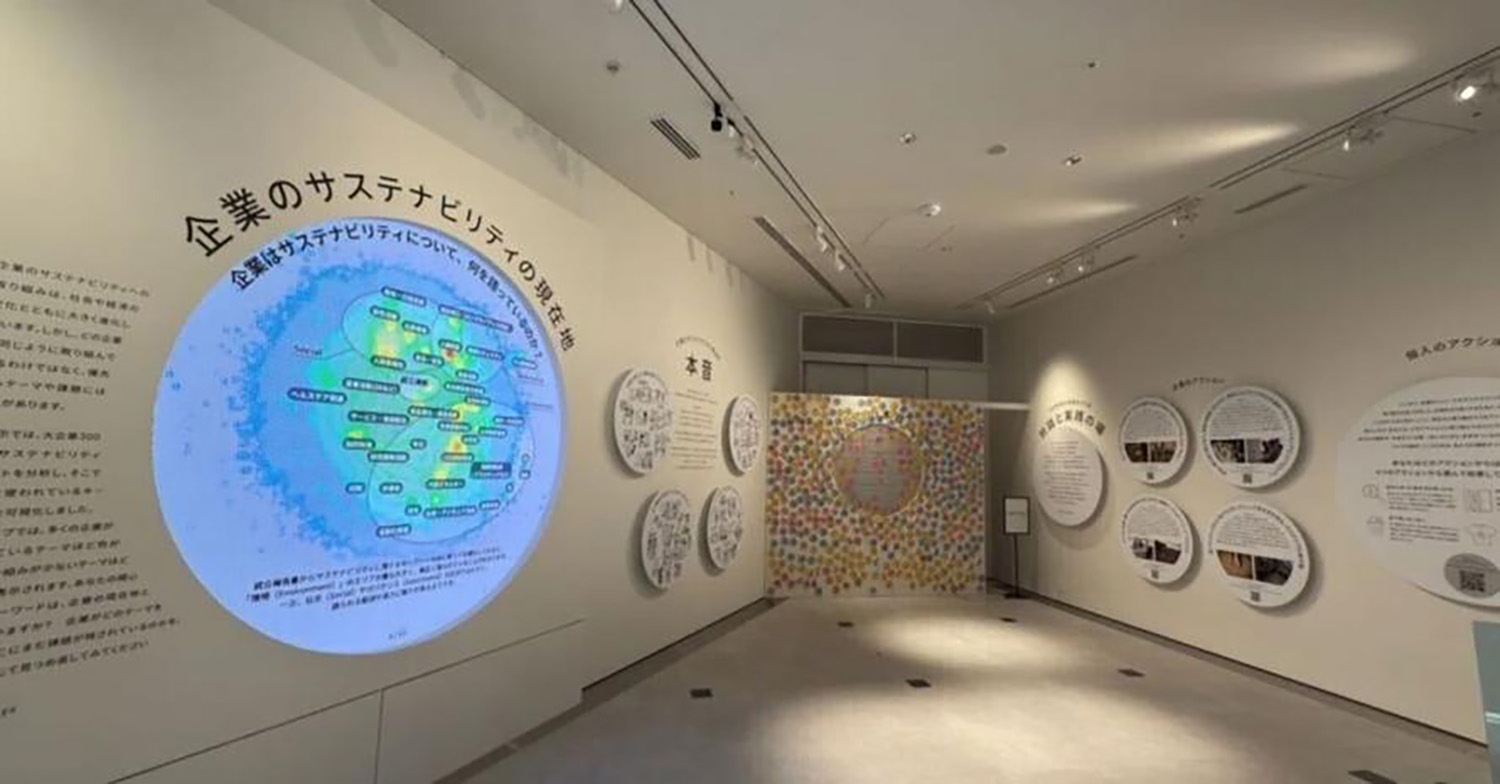 上場企業300社の統合報告書をもとにデータ分析した俯瞰図と、サステナビリティ担当者へのインタビューから引き出す企業の現場担当者の本音、そして日本と海外事例を交えて記事で紹介している本展の特徴は、展示をご覧いただく方も参加できる双方向の展示であることです。展示をご覧になっている方向けに、個人の視点でサステナビリティに対する本音をシールに書き込んで貼っていただくコーナーは、壁一面があっという間に皆さんのコメントが書かれたシールでいっぱいになりました。
