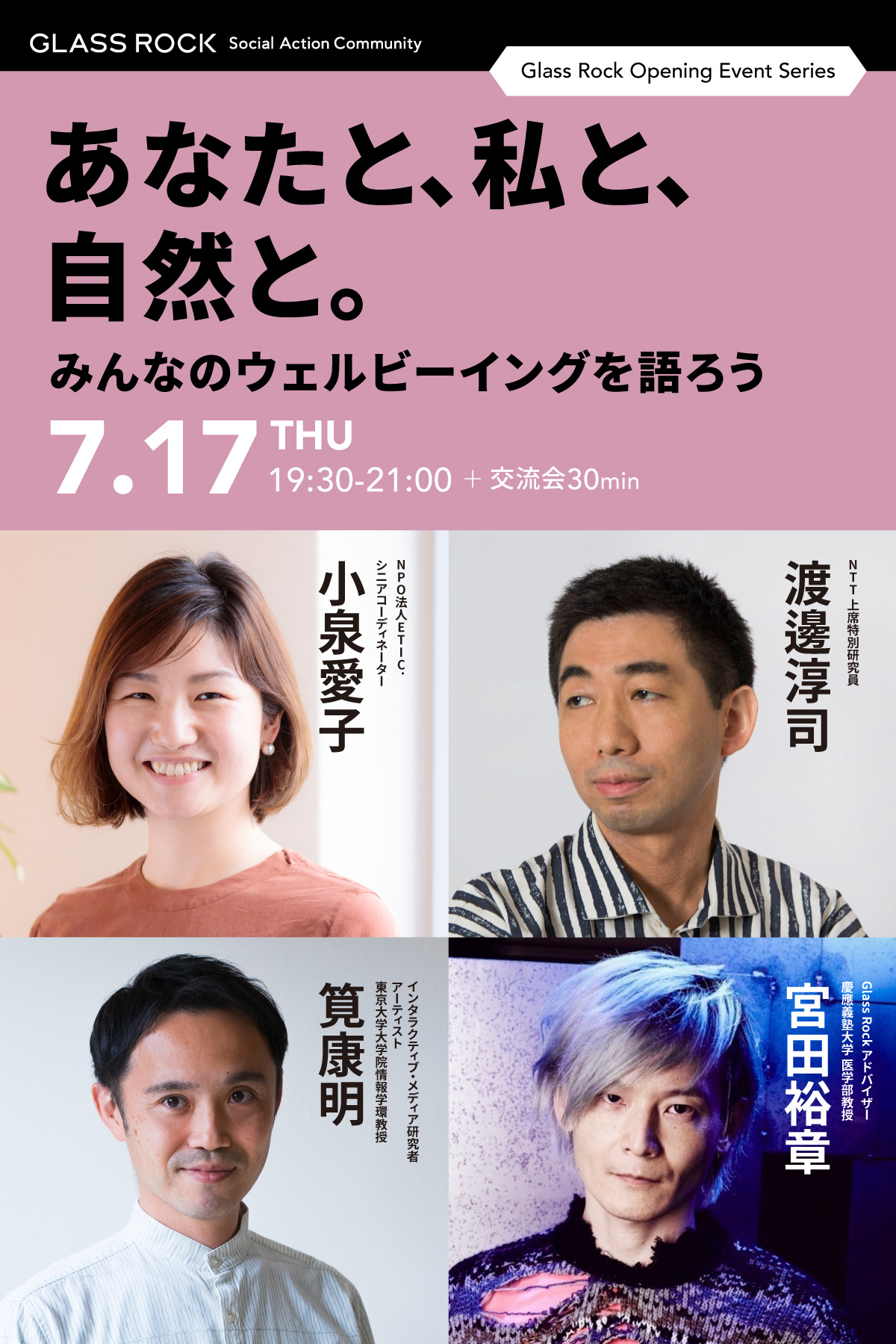 ビジネス、行政、非営利団体などがセクターを越えて複雑な社会課題の解決に向けて長期視点で取り組む共創プラットフォーム「Glass Rock 〜Social Action Community〜」の開業を機に開催してきた全5回のオープニングイベントシリーズ。Glass Rockに参画する共創パートナーの皆さんが、それぞれの分野の視点をクロスさせて社会課題について対話する最終回となる今回のテーマは「ウェルビーイング」です。