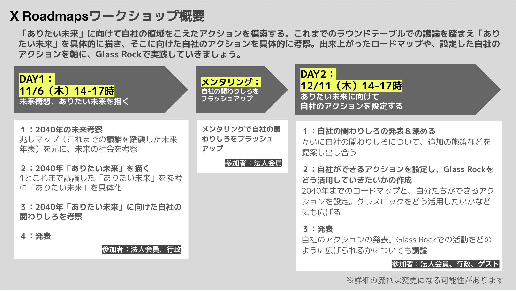 Day1ではこれまで月に2回開催してきた X Roadmapsのラウンドテーブルでの議論を参考に、法人会員の皆さんと「実現したい未来」を探索していきます。