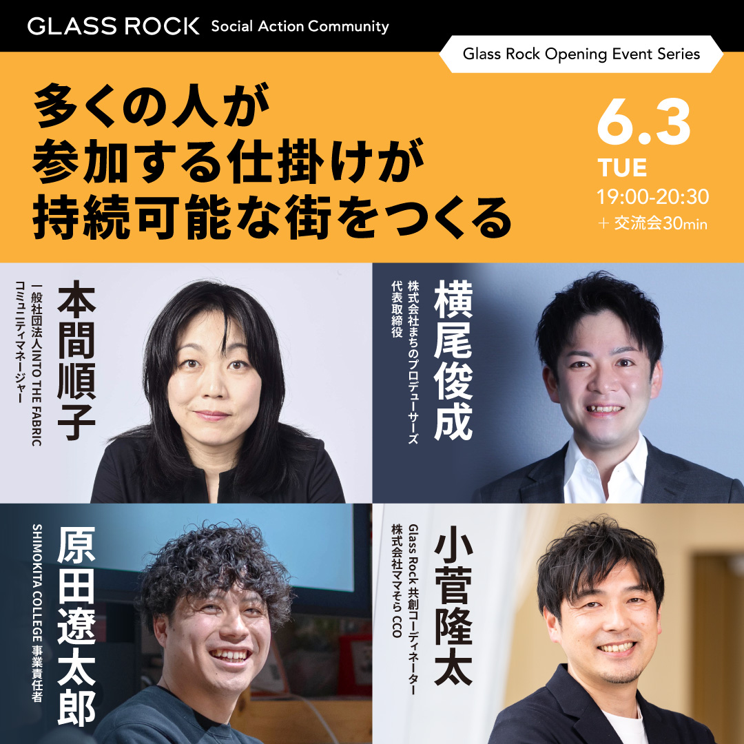ビジネス、行政、非営利団体などがセクターを越えて複雑な社会課題の解決に向けて長期視点で取り組む共創プラットフォーム「Glass Rock 〜Social Action Community〜」の開業を機に、全5回のトークセッションを開催します。