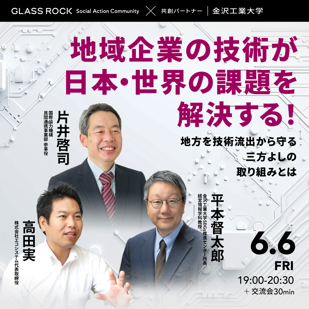 今回は、サステナビリティの文脈で地域企業とともに技術開発を行い、日本や世界の課題解決につながる事業を創出している、Glass Rockの共創パートナーである金沢工業大学のケースをもとに、ゲストをお招きして産学連携の現場で起きていることをお話いただきます。