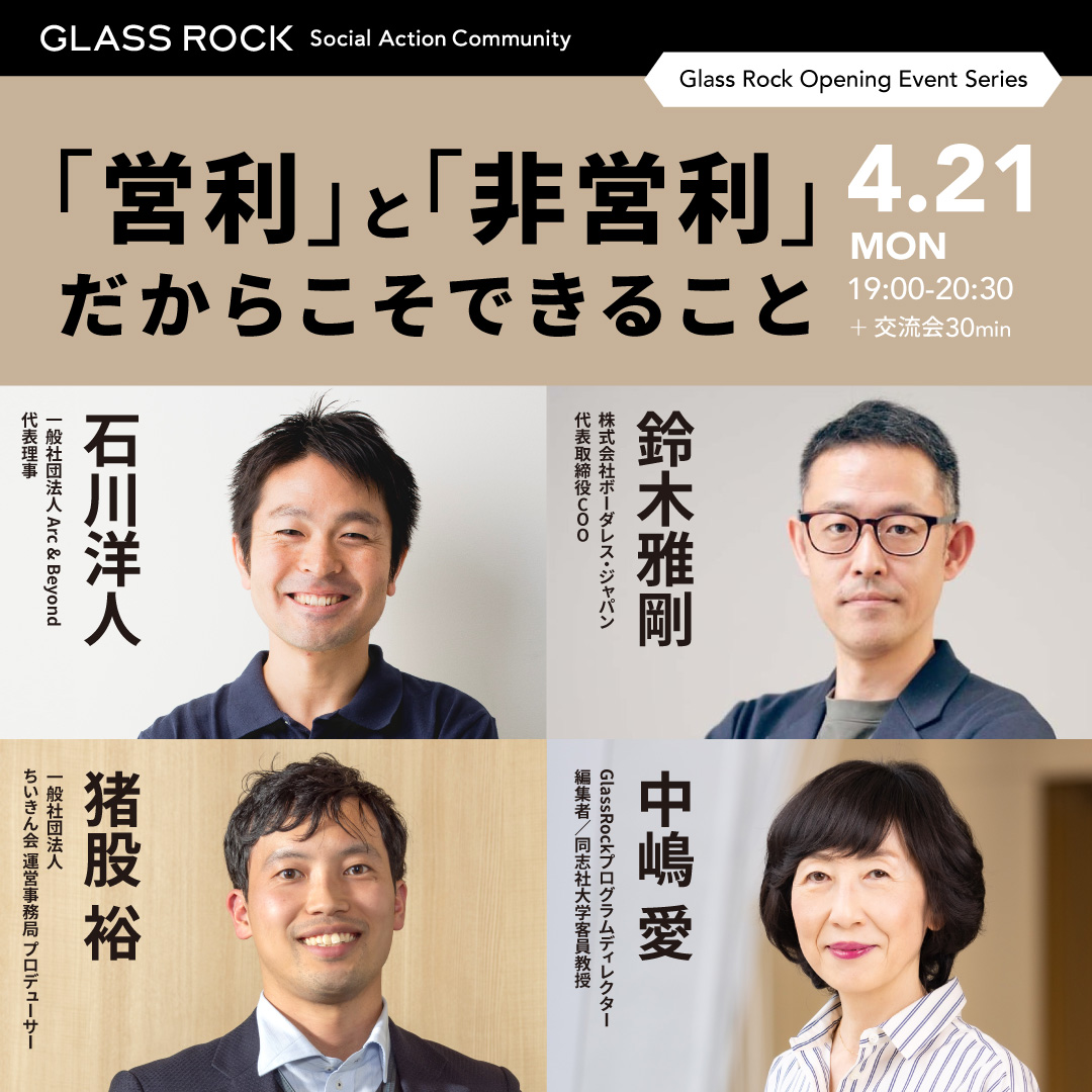 ビジネス、行政、非営利団体などがセクターを越えて複雑な社会課題の解決に向けて長期視点で取り組む共創プラットフォーム「Glass Rock 〜Social Action Community〜」の開業を機に、全5回のトークセッションを開催します。各回のイベントでは、グラスロックに参画する多様な共創パートナーの皆さんが、それぞれの分野の視点をクロスさせて社会課題について対話します。異なるセクターの視点が交差することで社会課題解決に向けて多様なかかわり方があることが見えてくるでしょう。そこから「わたし」に何ができるかを考えるきっかけやヒントが見つかるかもしれません 。
