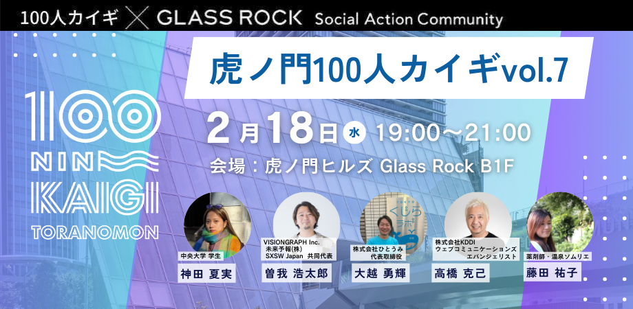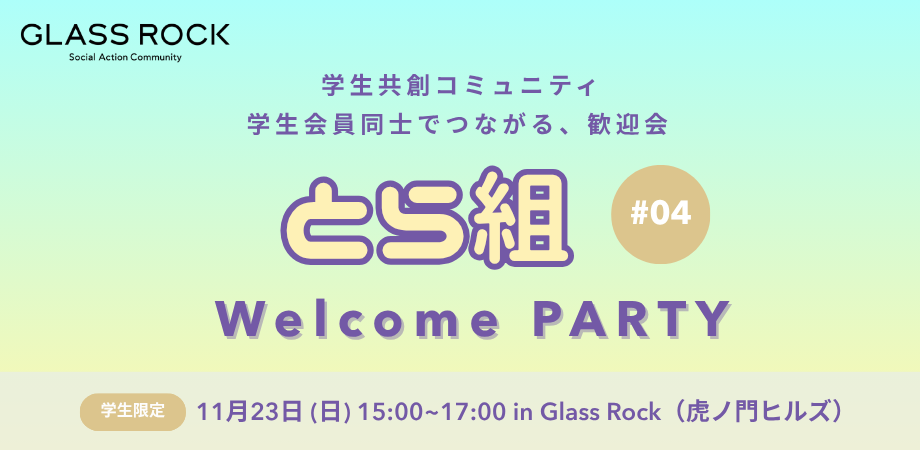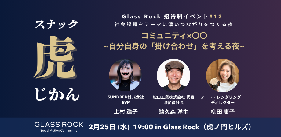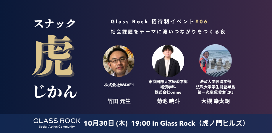 社会課題をテーマに深いつながりを生み出す夜の交流イベント「虎じかん」など、メンバーとそのゲストのための招待制イベントも開催しています。会員限定のGlass Rock Partyは、キッチンやバーカウンターで、ドリンク片手に盛り上がります。参加者の活動や知見に触れ、新たなつながりが生まれる交流の場です。