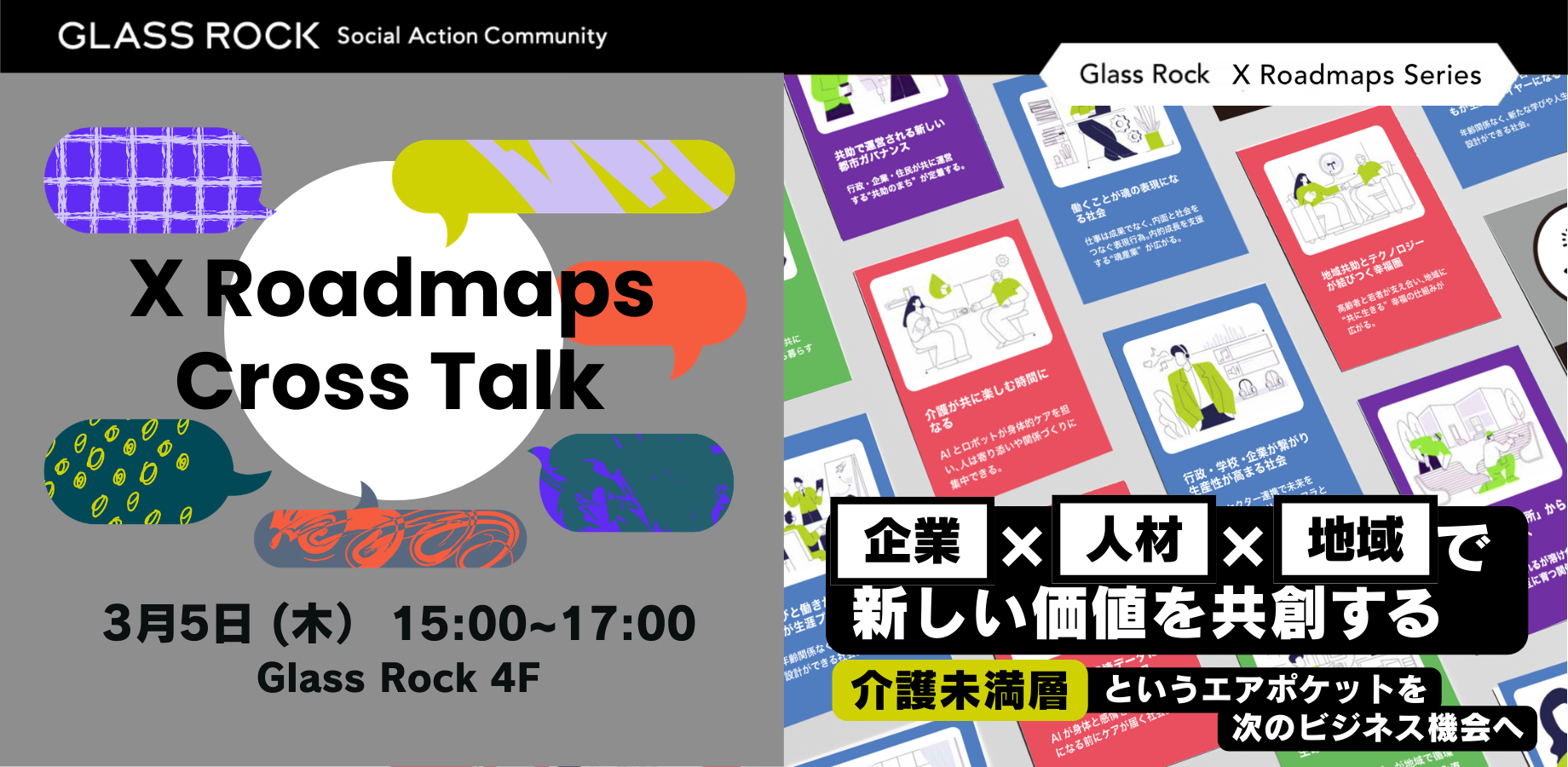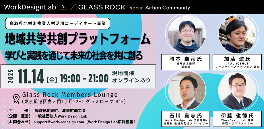 Glass Rockが構築するオリジナルプログラムの他、共創パートナーによる最前線の事例に触れるイベントや、実践を促進するワークショップ、またランチミートアップや交流会など、出会い、対話し、気づき、仲間と共に実践する場を設けています。